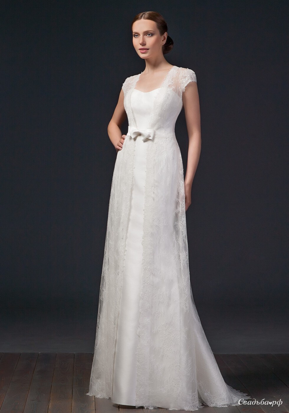 Лаконичное и элегантное, это платье создано для яркой невесты. Благодаря сочетанию тонкого кружева шантильи и необычной фактуре сатина это образ наверняка найдет образ в сердце современных невест