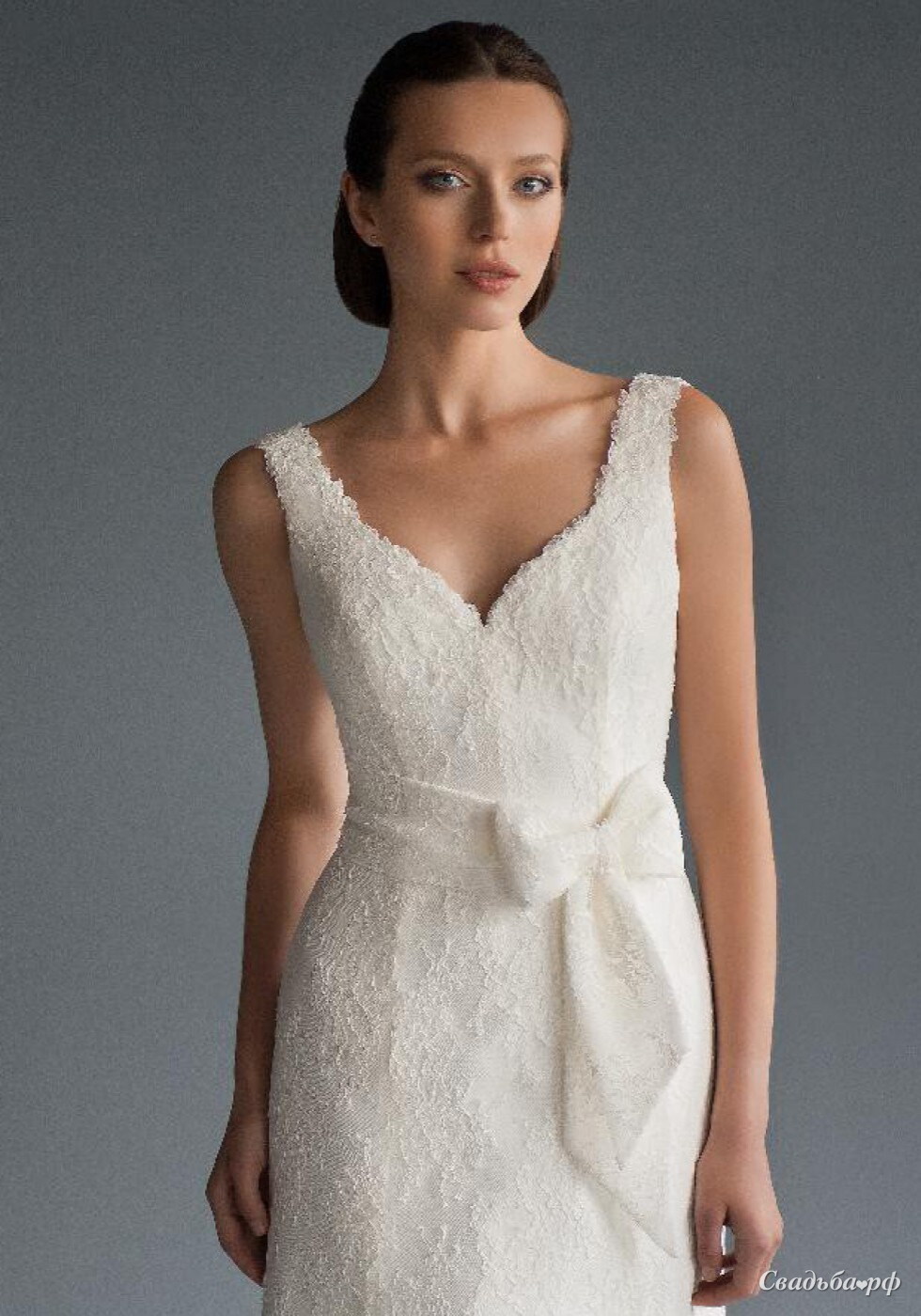 Шикарное кружевное платье правильного силуэта с небольшим шлейфом, изящной спиной и широким поясом. Великолепие этого платья сосредоточено в роскошном мягком кружеве с изящным плетением.
