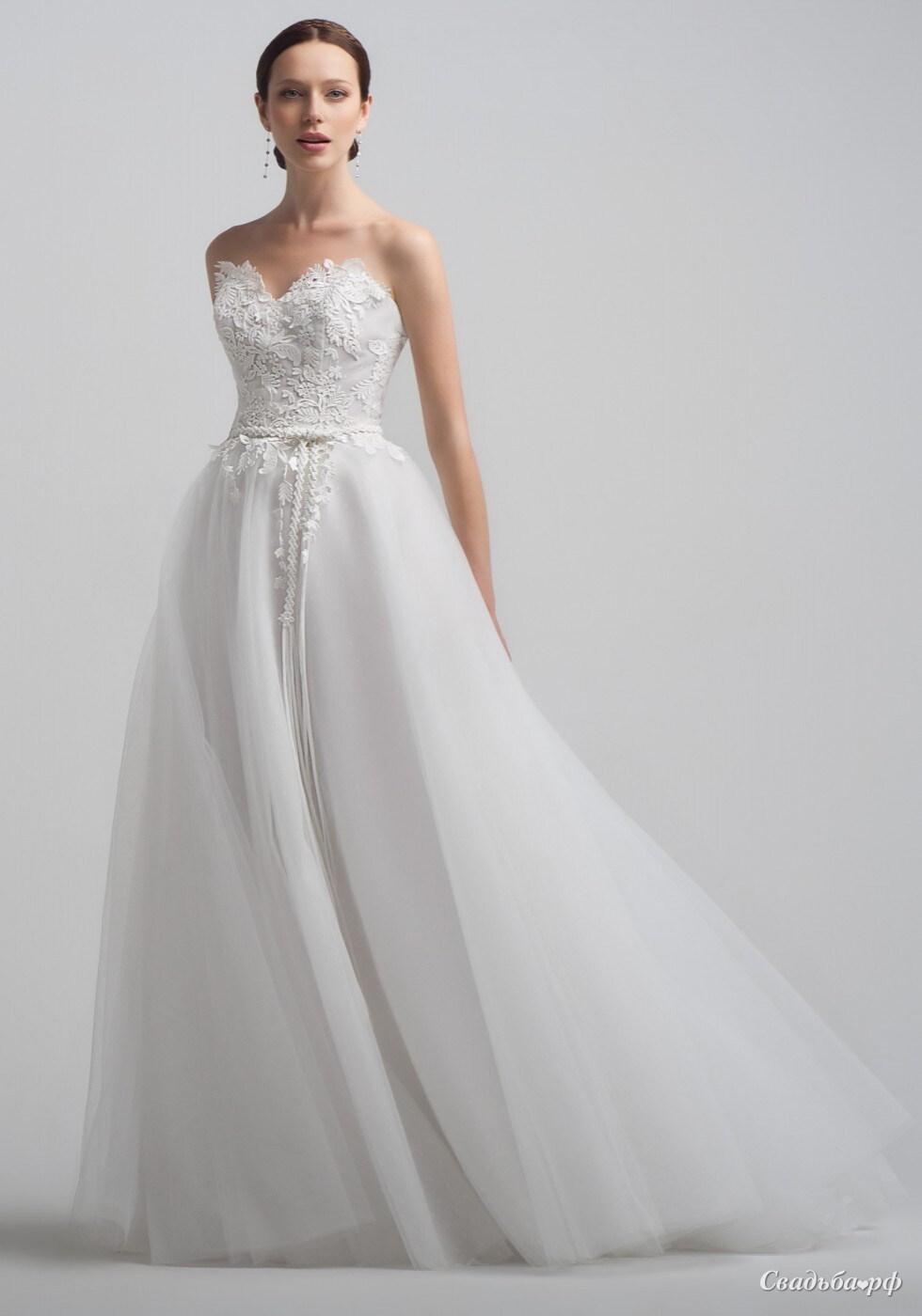Платье классического силуэта – принцесса. Но принцесса это необычная, а невероятно трепетная, легкая и нежная. Идеальное строение внутреннего корсета, женственная линия декольте и воздушная фатиновая юбка. Ткани и материалы: фатин, кружево.