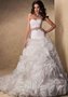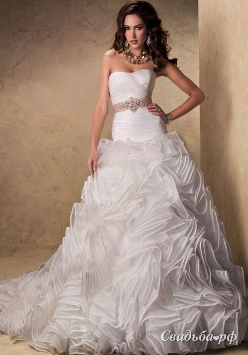 Шикарное свадебное платье А- силуэта из органзы Chic. Корсет ассиметрично драпирован, талия украшена атласным поясом с узорами из кристаллов Сваровски. Пышная юбка в оборках и завитках – изюминка наряда, волнистыми складками она спускается и образует шлейф. Шнуровка на спине обеспечивает идеальную посадку.