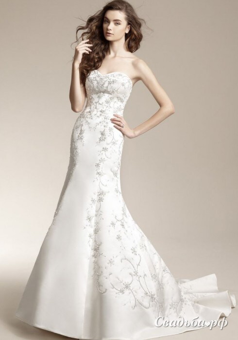 Роскошное прямое платье из итальянского атласа, по всей длине расшито узорами из нитей, бисера и камней. По спине проходит ряд атласных миниатюрных пуговиц. Шикарный шлейф завершает образ.