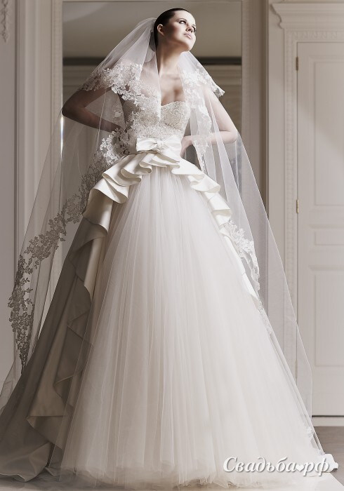 Роскошное, богатое свадебное платье А – силуэта. Корсет и лиф с вырезом сердечком декорированы, пышная многослойная тюлевая юбка имеет верхний слой, ткань гармошкой и изящными складочками опоясывает юбку и завершает образ шлейфом. Крупный бантик подчеркивает талию.