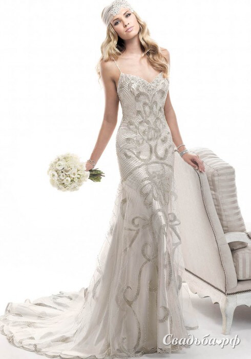Необычайно стильное платье, вдохновленное богемным шиком 20-х годов и эпохой Великого Гетсби являет собой воплощение мечты любой невесты. Сверкающая вышивка вместе с затейливым декоративным рисунком из кристаллов, бусин и бисера добавляют платью шика и красоты. Вырез сердечком подчеркивает хрупкость и женственность фигуры. Наряд дополнен изящной молнией сзади.