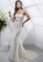 Платье, выполненное из классического кружева Chantilly, изящного A-силуэта. Утонченным дополнением наряда служит тонкий пояс с металлическим бантиком, который очень актуален в этом сезоне. Пояс на подвенечном платье служит модным высказыванием, делая наряд невесты особенным. Наряд дополнен изящной молнией сзади.