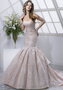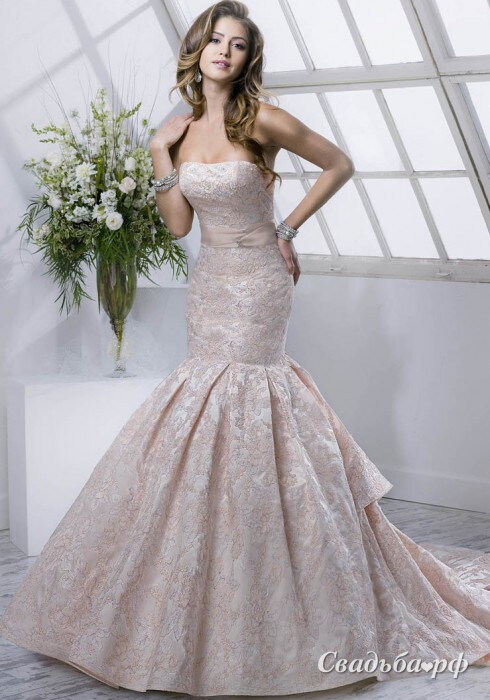 Продуманное до мельчайших деталей платье силуэта «Рыбка», выполненное из атласа, поверх которого в витиеватые узоры сплетается вышивка ручной работы. Талия подчеркнута корсажной лентой с брошью, декорированной кристаллами. Пышная юбка плавно переходит в венчальный шлейф, завершающий гармоничный образ современной принцессы. Наряд дополнен изящной молнией сзади.