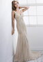 Элегантное платье в стиле 20-х годов выполнено из атласа Evita, окутанного тюлем, богато декорированным бусинами, кристаллами, бисером, жемчугом и вышивкой. Драматизм и выразительность образу придает как сам силуэт, так и необычный узор вышивки, который своими четкими линиями выражает изысканное чувство стиля невесты. Наряд дополнен изящной молнией сзади.