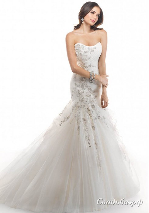 Необычное, запоминающееся, романтичное платье классического силуэта, одновременно пронизанное современной эстетикой. Цветочные аппликации ручной работы изящно окутывают поверхность платья. Драпировка, делающая любую фигуру идеальной, плавно переходит в пышную юбку, дополненную венчальным шлейфом. Платье также представлено со съемным цветочным аксессуаром на плечо. Наряд дополнен изящной молнией сзади, поверх которой тянется ряд аккуратных пуговок.
