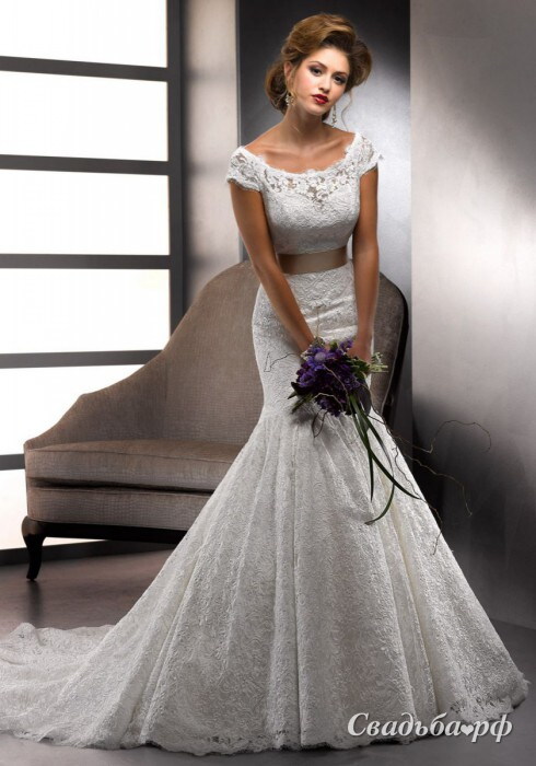 Чарующее свадебное платье из винтажного кружева. Прозрачная ажурная ткань с оборочками нежно обрамляет плечи и спину, придавая образу королевскую величавость и грациозность. Атласные пуговицы подчеркнут статность невесты. Талия выделена контрастным поясом. Шикарный шлейф завершает образ.