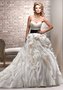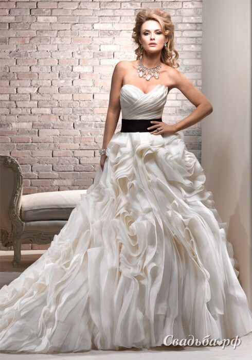 Ультрасовременное, модное платье, выполненное из органзы Opal, является воплощением мечты любой невесты. Сложносочиненная юбка, ниспадая пышными волнами, плавно переходит в небольшой шлейф. Необычный топ, драпированный таким образом, чтобы подчеркнуть всю женственность и изящество невесты, дополнен черным поясом, акцентирующим талию.