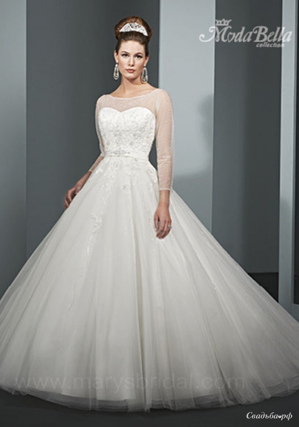 Нежное и элегантное, это свадебное платье выполнено в тафте. Женственное декольте сердечком акцентировано вставками из тюля по линии декольте и рукавов. Корсет платья декорирован искусной вышивкой, а таллия подчеркивается лентой с брошью из кристаллов Swarovski. Венчальный шлейф гармонично завершает образ наряда.