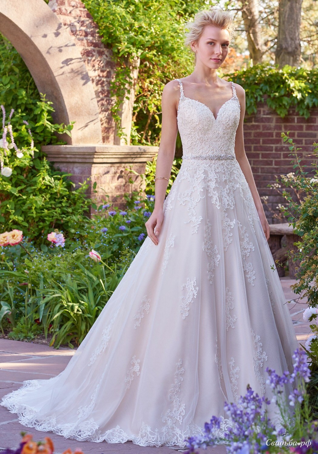 Роскошное кружевное свадебное платье А-силуэта на бретелях, V-образным вырезом декольте, с открытой спиной и застежкой на пуговицах.