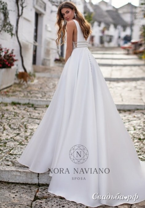 Стильное свадебное платье А-силуэта, с глубоким V-образным вырезом по груди и спинке, на бретелях. Платье выполнено из атласа, линия талии изысканно украшена кристаллами и бисером, в боковых складках юбки спрятаны удобные карманы. Завершает образ небольшой легкий шлейф по длине которого расположен ряд пуговиц.