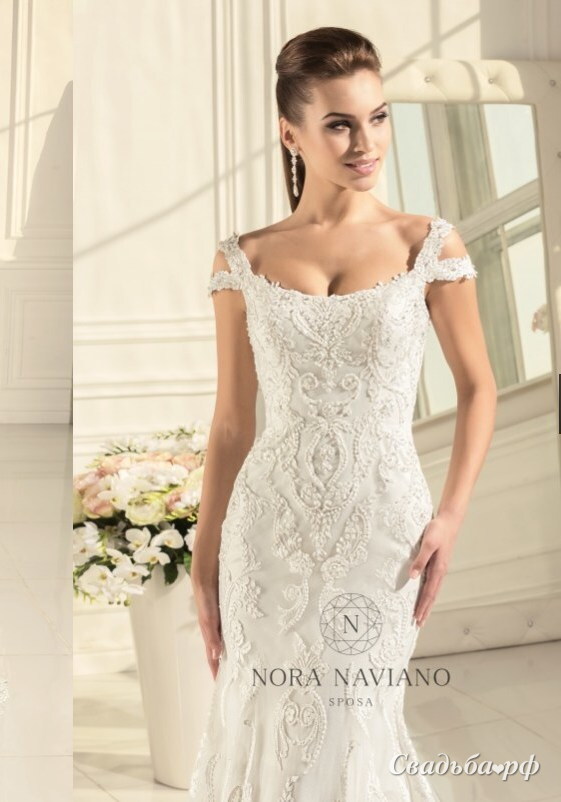 Стильное свадебное платье прямого силуэта, с углубленным вырезом по груди на бретелях.