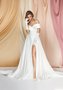 Стильное свадебное А-силуэта со спущенными плечиками, выполнено из английского атласа. По юбке платья заложены складки, в двух из которых спрятаны удобные карманы, разлетающиеся полы платья приоткрывают стройные ноги и делают образ обворожительным. Завершает образ небольшой атласный шлейф.