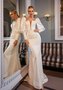 Романтичное свадебное платье приталенного силуэта с глубоким V-образным вырезом по линии декольте и объемными рукавами. Платье выполнено из мерцающей ткани. Завершает образ небольшой шлейф.