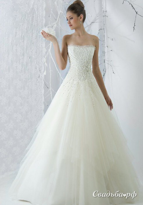 Пронзительно белый свадебный наряд от известного бренда Nava Bride поможет создать романтичный и нежный образ. Корсет с открытой зоной декольте украшен сверкающей вышивкой, словно стекающей на верхнюю часть юбки. Полупрозрачная оборка по верхнему краю корсета придаёт образу лёгкость. Длинная юбка из невесомой ткани расширяется к полу.