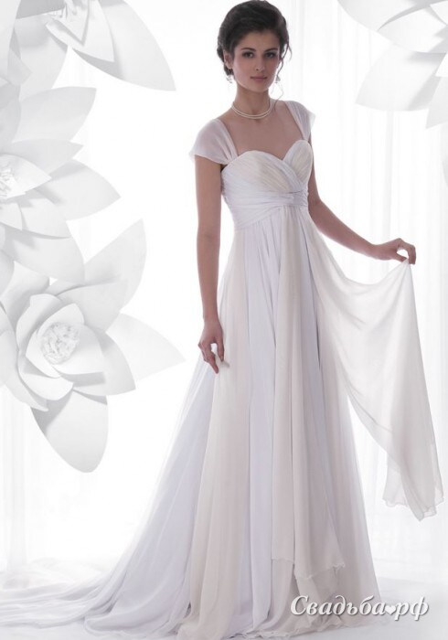 Романтичный свадебный наряд от известного бренда Nava Bride выполнен из тончайшей белой ткани. Открытая зона декольте обрамлена широкими бретелями-плечиками. Лёгкая драпировка эффектно подчёркивает бюст. Длинная юбка струится до пола и переходит в роскошный шлейф. Такой наряд в греческом стиле зрительно вытягивает силуэт.