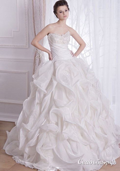 Оригинальное свадебное платье от именитого бренда Nava Bride понравится романтичным и нежным натурам. Драпированный корсет с открытой зоной декольте по бюсту расшит сверкающими стразами и бисером. Наряд акцентирует внимание на груди и выгодно подчёркивает талию. Изюминка модели – пышная юбка с вертикальными воланами из лёгкой ткани.