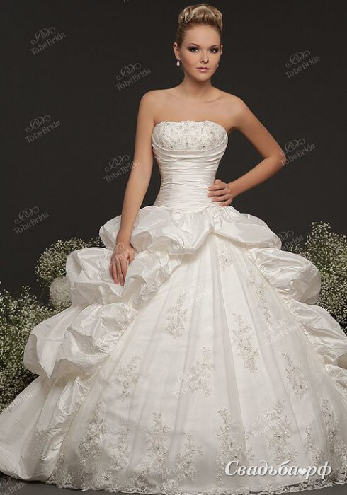 Эффектное свадебное платье от признанного законодателя свадебной моды, бренда To be Bride. Драпированный корсет с оголённой зоной декольте и сверкающей вышивкой на груди зрительно увеличивает бюст и акцентирует внимание на плечиках и обнажённых руках невесты. Пышная юбка с объёмными сборками также украшена сверкающими вставками.