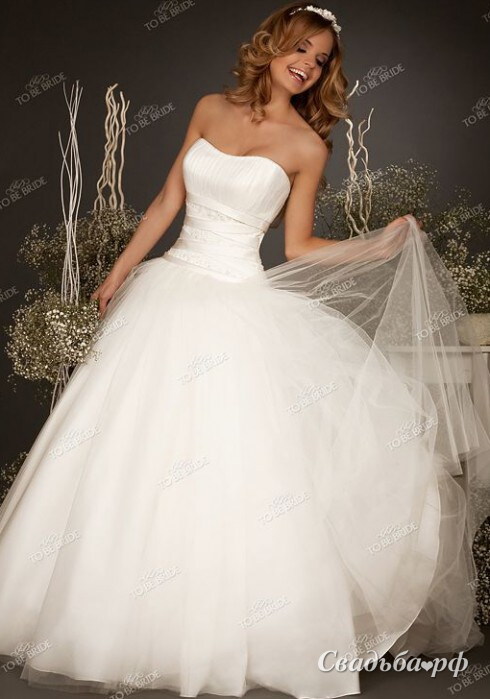 Сказочное свадебное платье А-силуэта от американского бренда To be Bride создано для элегантной невесты. Изящный шлейф с открытой зоной декольте и тонкой драпировкой на груди. Талия подчёркнута лентами, зрительно уменьшающими объёмы. Пышная юбка с полупрозрачным верхним слоем напоминает лёгкое облако. Поистине королевский свадебный наряд.