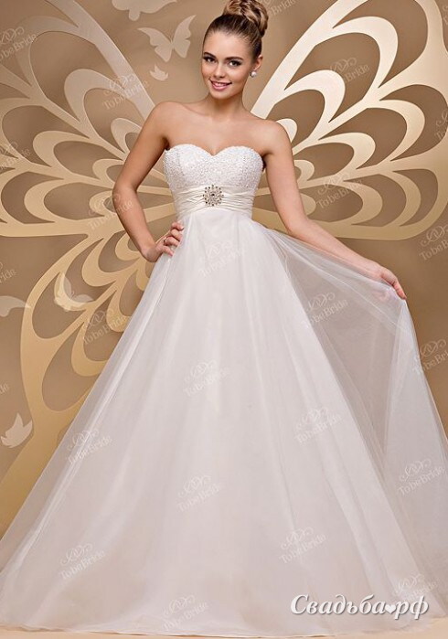 Трогательный свадебный наряд от известного американского бренда To be Bride. Зрительно вытягивает фигуру. Хотите казаться выше и стройнее? Тогда этот наряд создан специально для Вас! Миниатюрный корсет с открытой зоной декольте и сверкающей вышивкой дополнен широким поясом и брошью в форме цветка. Юбка струится до самого пола.