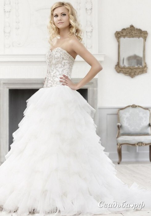 Романтичное свадебное платье понравится самым требовательным модницам. Элегантный корсет с оголённой зоной декольте акцентирует внимание на плечиках и обнажённых руках невесты. Верх украшен тонкой вышивкой ручной работы. Пышная юбка с многоярусными воланами из тончайшей ткани придаёт образу неземную лёгкость и королевский шик.