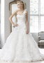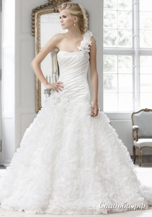 Эффектный свадебный наряд с единственной бретелью и оголённой зоной декольте идеально садится по фигуре. Объёмный декор на плечике придаёт образу особый шик. Заниженный корсет с лёгкими складками драпировки деликатно скрывает малейшие несовершенства. Пышная юбка начинается от уровня бёдер и отличается необычной фактурой. Модель дополнена шлейфом.