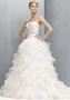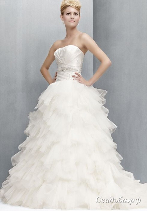 Воздушный свадебный наряд с открытой зоной декольте поможет создать незабываемый образ современной королевы. Оригинально драпированный корсет со сверкающим поясом идеально садится по фигуре и зрительно увеличивает бюст. Пышная юбка со множеством воланов из тонкой ткани напоминает лёгкое облако. Юбочка переходит в кокетливый шлейф.