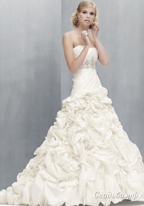 Оригинальный свадебный наряд с оголённой зоной декольте акцентирует внимание на обнажённые руки и прекрасные плечики невесты. Заниженный корсет со сверкающим поясом великолепно садится по фигуре. Пышная юбка с оригинальными сборками переходит в шлейф. Наряд смотрится воздушно и неповторимо – как раз то, что нужно современной принцессе.