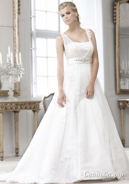 Белоснежное свадебное платье с открытой зоной декольте и широкими бретелями из полупрозрачной ткани создано для нежных и романтичных невест. Талия украшена атласным пояском со сверкающей вышивкой. Длинная юбка расширяется к полу и переходит в шлейф. Наряд не перегружен декором, благодаря чему смотрится изысканно и благородно.
