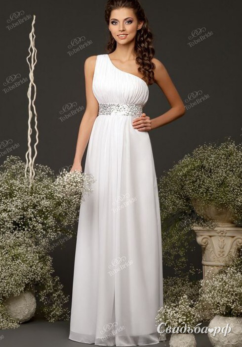 Свадебное платье в стиле Ампир – это беспроигрышный вариант для романтичных и женственных натур. Представленный наряд от всемирно известного бренда To be Bride дополнен широким пояском, переливающимся в лучах света. Единственная бретель и тонкая драпировка акцентируют внимание на бюсте. Длинная юбка свободного кроя зрительно вытягивает фигуру.