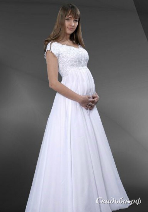 Потрясающее свадебное платье подойдёт даже невестам в интересном положении. Наряд отличается комфортной посадкой по фигуре, элегантным силуэтом и безупречным пошивом. V-образный вырез на груди придаёт образу кокетство. Короткие рукавчики и вся верхняя часть платья украшена объёмной вышивкой. Длинная юбка струится до самого пола.