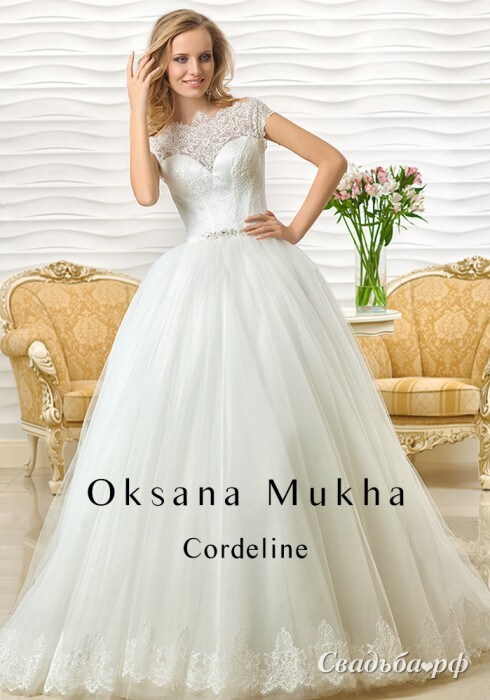 Романтичный свадебный наряд А-силуэта с полупрозрачной вставкой на груди и кокетливо закрытыми плечиками. Корсет подчёркивает талию и бюст, акцентирует внимание на обнажённых руках. Сверкающая вставка на пояске придаёт образу романтичность. Невесомая юбка с ажурной окантовкой напоминает воздушное облако. Женственный наряд для нежной красавицы.