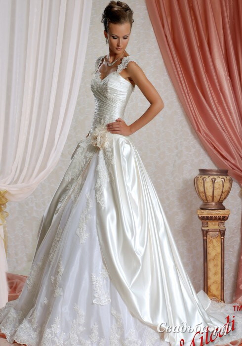 Свадебное платье в стиле принцесса ненавязчиво войдет в гармонию с вашим очарованием и обаянием. Шикарный струящийся атлас, задрапированный на лифе, и широкие бретели из нежного кружева составляют верх наряда. Объемная юбка с овальными складками открывает тончайшую подкладку, декорированную вышивкой, а ее шлейф завершает элегантный образ.
