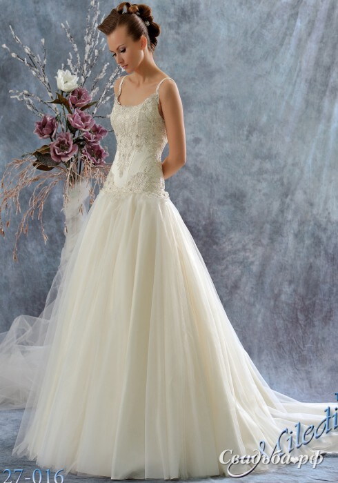 Женственный наряд с оголённой зоной декольте и тончайшими бретелями понравится романтичной особе. Заниженный корсет украшен сверкающей вышивкой ручной работы. Пышная юбка с мягкими складочками и длинным шлейфом поражает своей лёгкостью и воздушностью форм. Безупречный вариант для создания невинного образа современной невесты.