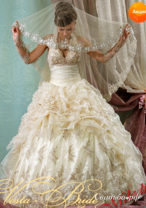 Мечтаете о роскошном свадебном платье? Тогда эта модель создана для Вас! Глубокий вырез на груди в сочетании с проймой-американкой и объёмной вышивкой на груди приковывают внимание к бюсту. Талия подчёркнута тонкой драпировкой. Пышная юбка с объёмными сборками и золотистой вышивкой поражает своей лёгкостью и богатством декора. Королевский образ!