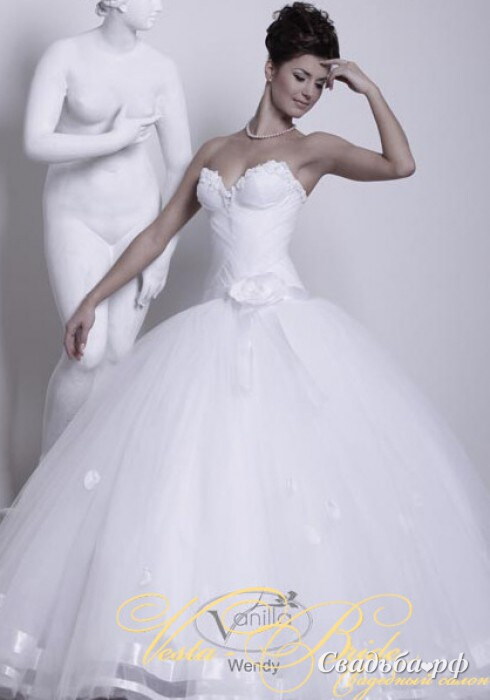 Королевское свадебное платье с открытой зоной декольте и пикантно подчёркнутым бюстом станет изюминкой Вашего неповторимого образа в такой торжественный день. Корсет с тонким декором по верхнему краю идеально садится по фигурке. Пышная юбка из невесомой ткани окантована атласной лентой и украшена несколькими лепестками.