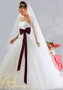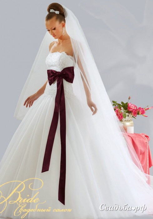 Роскошное свадебное платье с заниженным корсетом и открытой зоной декольте идеально садится по фигуре. Корсаж украшен кружевом и вышивкой. Пышная юбка с королевским шлейфом выполнена из множества слоёв лёгкого фатина. Изюминка представленного наряда – контрастный поясок с крупным бантом и лентами, спускающимися на юбку.