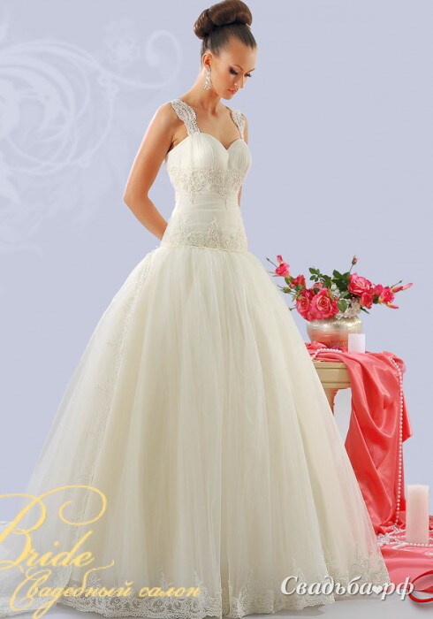 Нежным и романтичным натурам придётся по вкусу это свадебное платье с декольтированным корсетом и переливающимися бретелями. Корсаж чуть занижен и украшен тонкой вышивкой ручной работы. Пышная юбка с кружевной окантовкой отличается безупречными формами и минимализмом декора. Достойное дополнение Вашего сногсшибательного свадебного образа.