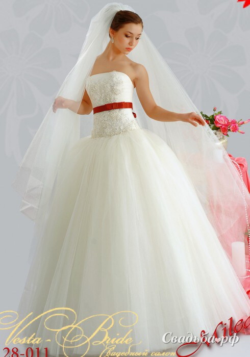 Очаровательное свадебное платье покоряет с первого взгляда необычным сочетанием белого и красного. Кружевной корсет с открытой зоной декольте украшен контрастным поясом с небольшим бантиком. Пышная юбка из нескольких слоёв тонкого фатина напоминает лёгкое облако. Свадебный наряд отличается элегантностью и минимализмом декора.