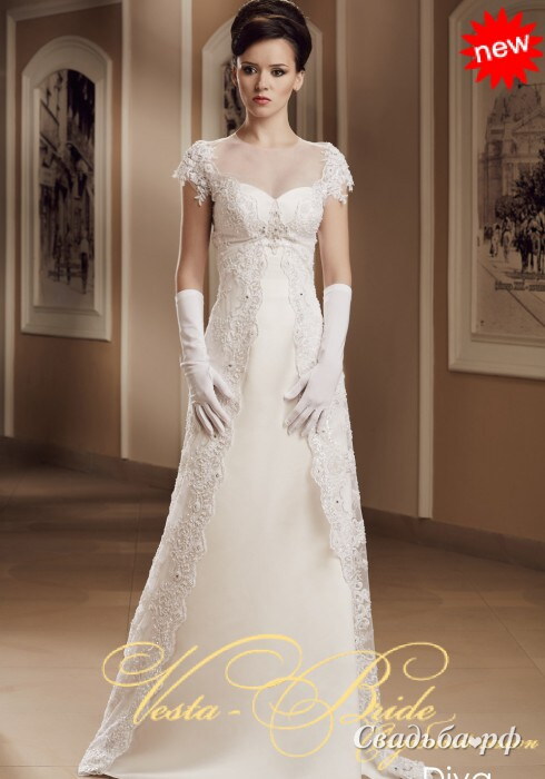 Элегантное свадебное платье с открытой зоной декольте и ажурными плечиками достойно истинной леди! Завышенная талия украшена сверкающей вставкой. Кружевная драпировка мягко переходит с верхней части наряда на длинную юбку. Модель дополнена кокетливым шлейфом из такого же расшитого вручную кружева. Наряд визуально стройнит свою обладательницу.