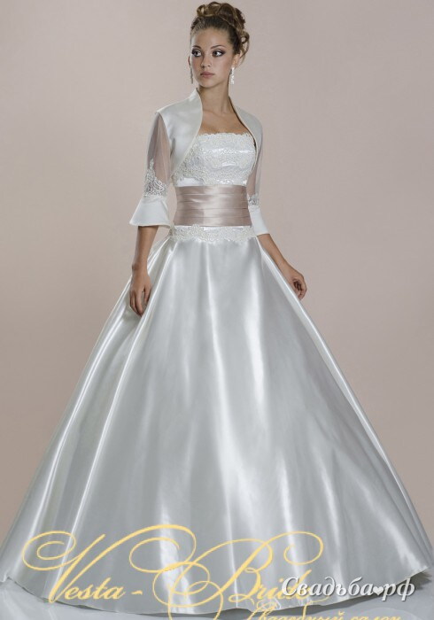 Свадебное платье с кокетливым болеро представлено украинским брендом Lily. Декольтированный корсет украшен тонким кружевом и широким поясом контрастного цвета. Эта вставка зрительно уменьшает талию. Пышная юбка переливается в лучах света. При покупке свадебного платья в первый день примерки - скидка 5% - 19 000 руб. + чехол для платья в подарок.