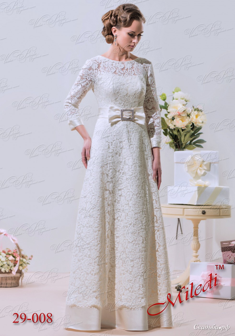 Кружевной свадебный наряд от известного бренда Miledi идеально подойдёт для венчания. Закрытый верх и длинные рукава придают образу целомудренность и трогательную нежность. Талия подчёркнута широким поясом с бантом и сверкающей пряжкой. Длинная юбка с атласной окантовкой расширяется к полу и визуально вытягивает силуэт.