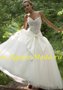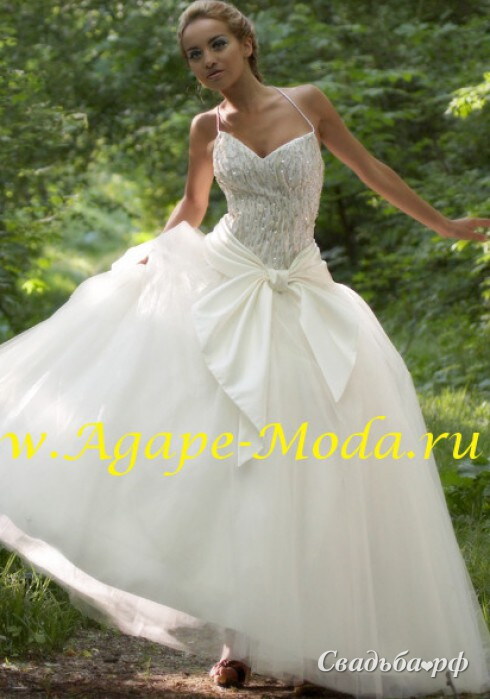 Восхитительный свадебный наряд с соблазнительно оголённой зоной декольте и тончайшими бретелями. Удобный корсет полностью расшит бисером и стразами, благодаря чему наряд переливается при каждом луче света. Пышная юбка с полупрозрачным верхним слоем придаёт образу торжественность. Граница между юбкой и корсетом обозначена объёмным поясом с бантом.