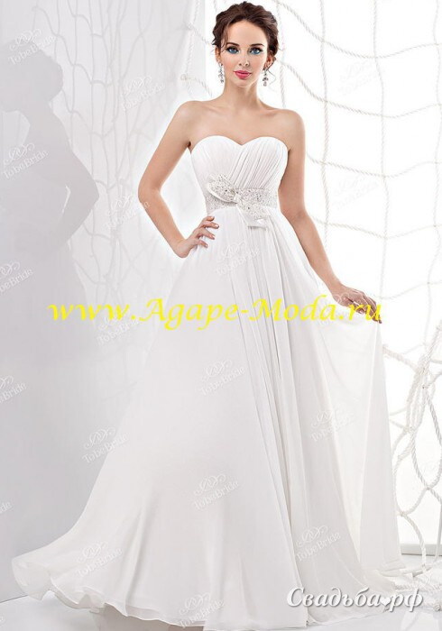 Восхитительный свадебный наряд из лёгкого шифона поможет создать романтичный и чувственный образ. Драпированный корсет с пикантно оголённой зоной декольте дополнен широким поясом с вышивкой и кокетливым бантом. Длинная юбка расширяется к полу и переходит в небольшой шлейф. Лаконичный и стильный наряд для истинной леди.