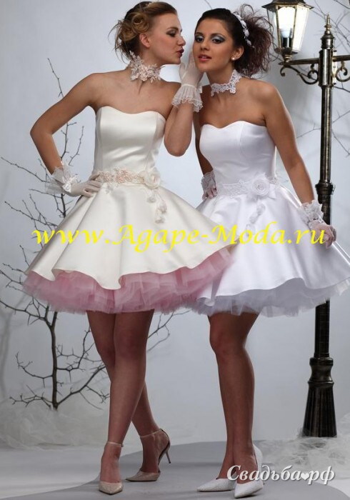 Игривый свадебный наряд понравится самой жизнерадостной и кокетливой невесте. Безупречно гладкий атлас эффектно сочетается с пышным подъюбником из полупрозрачной ткани. Корсет без декора открывает зону декольте и подчёркивает достоинства фигуры. Талия украшена цветами ручной работы. Очаровательная юбочка доходит до середины бедра.