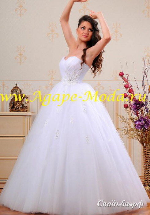Лёгкое свадебное платье классического А-силуэта представлено лучшими отечественными дизайнерами. Миниатюрный корсет с оголённой зоной декольте выгодно подчёркивает бюст. Талия украшена сверкающей вышивкой в форме цветка. Пышная юбка из нескольких слоёв невесомой ткани декорирована сверкающими вставками. Вы будете неотразимы!
