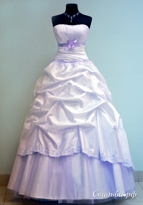 Очаровательный свадебный наряд с открытой зоной декольте поможет создать романтичной образ юной невесты. Драпированный корсет украшен сверкающей вышивкой и атласной лентой нежно-фиолетового цвета. Наряд подчёркивает талию. Пышная юбка с объёмными сборками драпировки смотрится сногсшибательно. Классический А-образный образ.