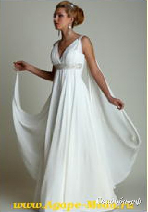 Струящийся свадебный наряд в греческом стиле создан для истинной богини с высокого Олимпа. Соблазнительный V-образный вырез на груди обрамлён бретелями со сверкающими вставками на плечах. От бретелей на спинке отходит длинный шлейф. Завышенная талия вручную расшита стразами. Длинная юбка струится до пола и зрительно вытягивает фигуру.