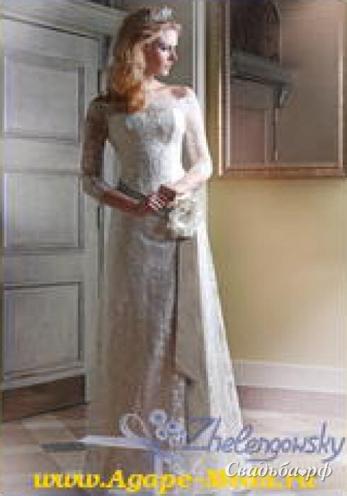 Элегантное свадебное платье с припущенными плечиками достойно царской особы. Обтягивающие рукава длиной 3/4 и идеально садящийся по фигуре корсет придают образу особый шик. Длинная юбка облегает бёдра и чуть расширяется к полу. Талия подчёркнута поясом с бантом. Эффектный свадебный наряд с кружевным узором по всей длине.
